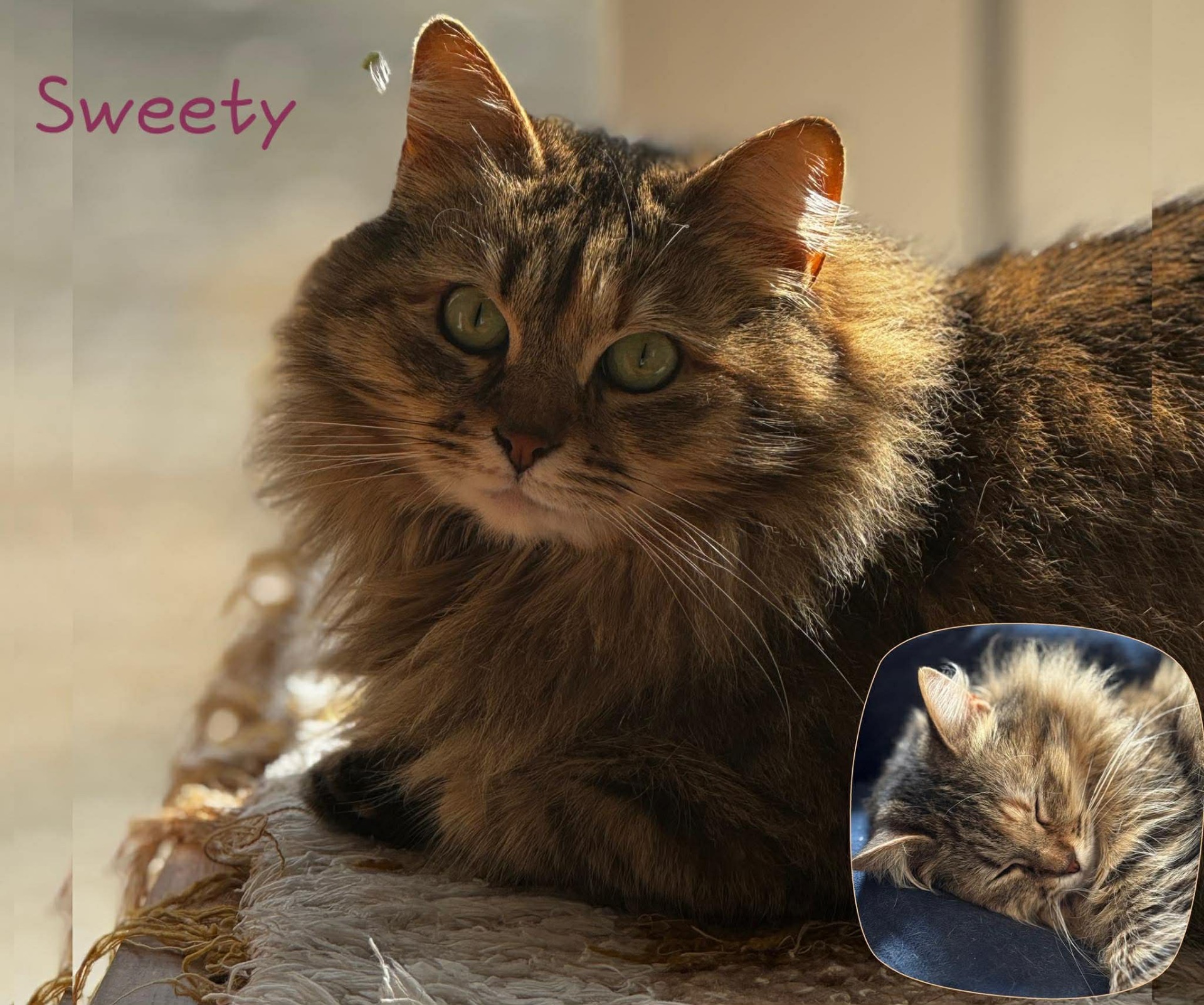 Derrière sa réserve se cache une chatte douce, qui aime les caresses… et la bonne nourriture. Avec son joli pelage mi-long et sa belle queue touffue, Sweety aura besoin d'un petit entretien régulier. Bonne nouvelle : elle apprécie plutôt bien les séances de brossage.